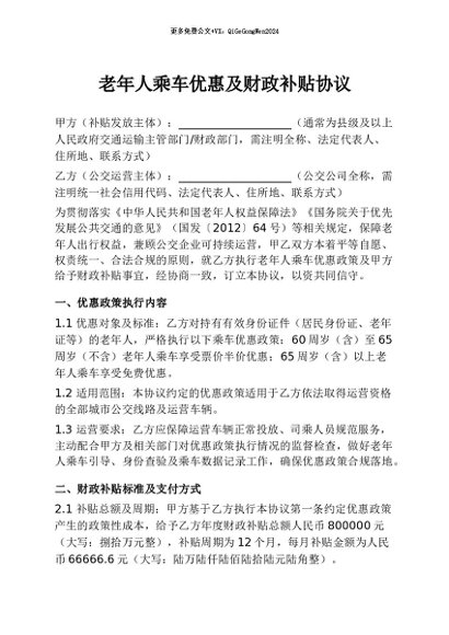 / 【七哥公文】2026年:老年人乘车优惠及财政补贴协议+更多免费公文+VX:QiGeGongWen2024