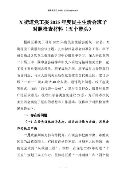【七哥公文】2026年:X街道党工委2025年度民主生活会班子对照检查材料(五个带头)+更多免费公文+VX:QiGeGongWen2024