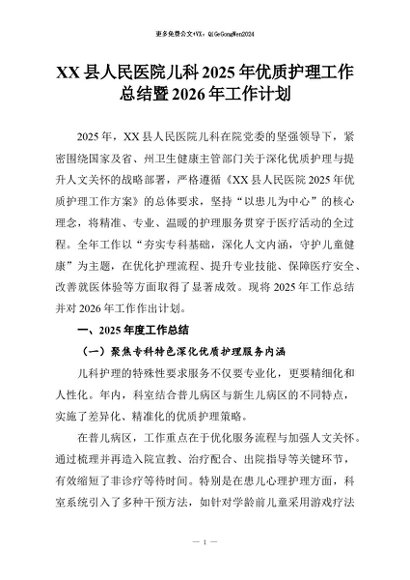 【七哥公文】2026年:XX县人民医院儿科2025年优质护理工作总结暨2026年工作计划+更多免费公文+VX:QiGeGongWen2024