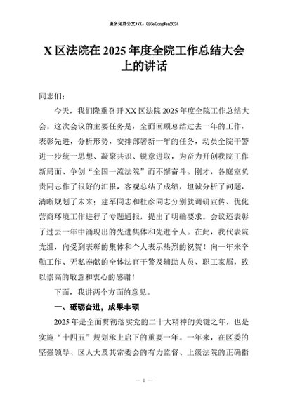 / 【七哥公文】2026年:X区法院在2025年度全院工作总结大会上的讲话+更多免费公文+VX:QiGeGongWen2024