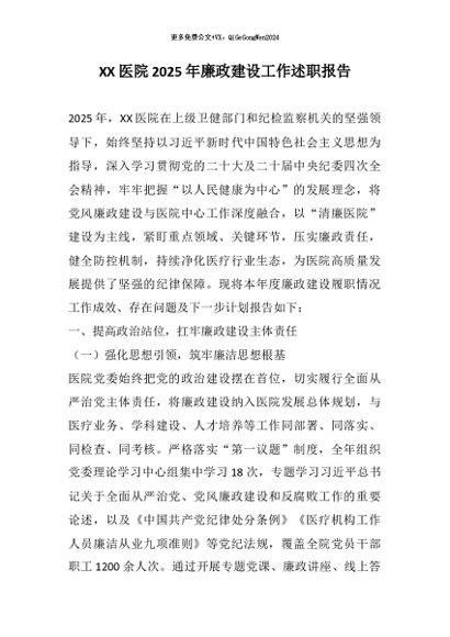 / 【七哥公文】2026年:XX医院2025年廉政建设工作述职报告+更多免费公文+VX:QiGeGongWen2024