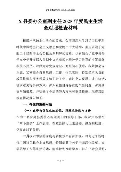 【七哥公文】2026年:X县委办公室副主任2025年度民主生活会对照检查材料+更多免费公文+VX:QiGeGongWen2024