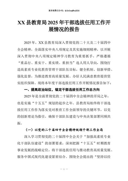 【七哥公文】2026年:XX县教育局2025年干部选拔任用工作开展情况的报告+更多免费公文+VX:QiGeGongWen2024