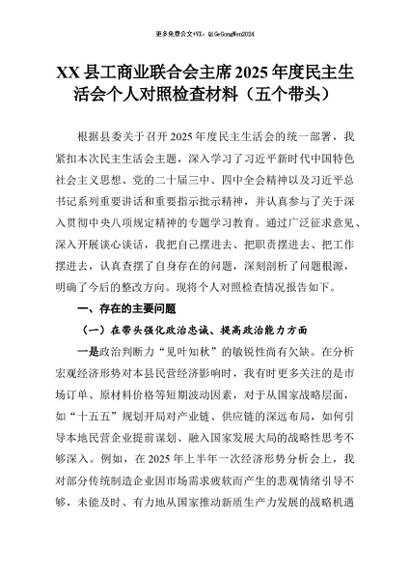 【七哥公文】2026年:XX县工商业联合会主席2025年度民主生活会个人对照检查材料(五个带头)+更多免费公文+VX:QiGeGongWen2024