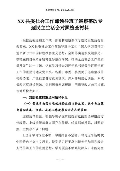 【七哥公文】2026年:XX县委社会工作部领导班子巡察整改专题民主生活会对照检查材料+更多免费公文+VX:QiGeGongWen2024