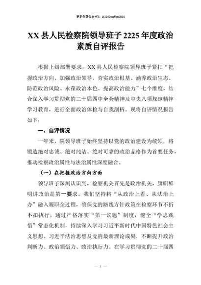 【七哥公文】2026年:XX县人民检察院领导班子2225年度政治素质自评报告+更多免费公文+VX:QiGeGongWen2024