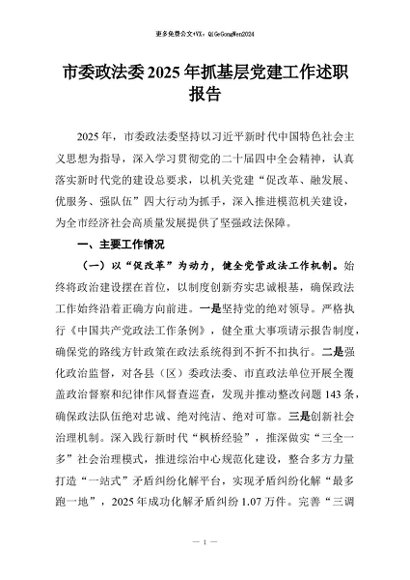 / 【七哥公文】2026年:市委政法委2025年抓基层党建工作述职报告+更多免费公文+VX:QiGeGongWen2024