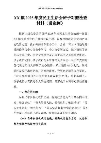 【七哥公文】2026年:XX镇2025年度民主生活会班子对照检查材料(带案例)+更多免费公文+VX:QiGeGongWen2024