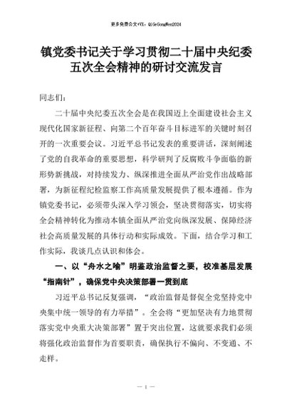 【七哥公文】2026年:镇党委书记关于学习贯彻二十届中央纪委五次全会精神的研讨交流发言+更多免费公文+VX:QiGeGongWen2024
