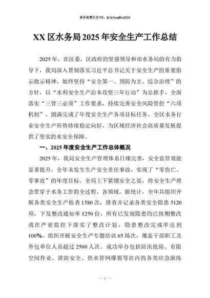 / 【七哥公文】2026年:XX区水务局2025年安全生产工作总结+更多免费公文+VX:QiGeGongWen2024