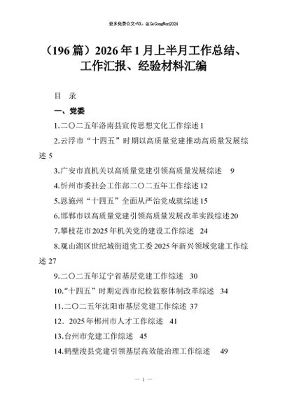 【七哥公文】2026年:(196篇)2026年1月上半月工作总结、工作汇报、经验材料汇编+更多免费公文+VX:QiGeGongWen2024