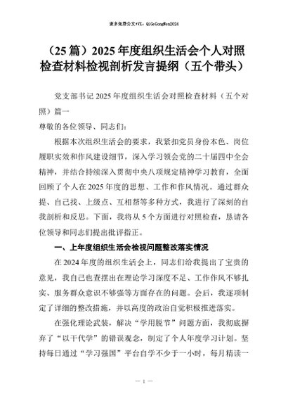 【七哥公文】2026年:(25篇)2025年度组织生活会个人对照检查材料检视剖析发言提纲(五个带头)+更多免费公文+VX:QiGeGongWen2024