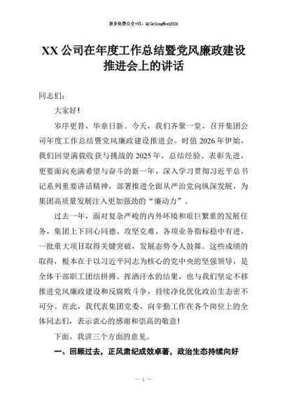 【七哥公文】2026年:XX公司在年度工作总结暨党风廉政建设推进会上的讲话+更多免费公文+VX:QiGeGongWen2024