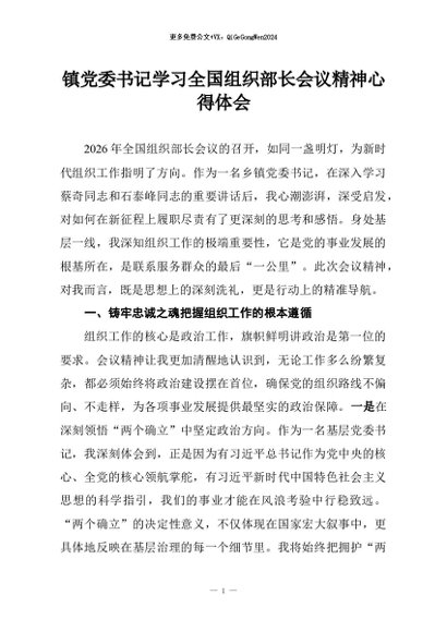 / 【七哥公文】2026年:镇党委书记学习全国组织部长会议精神心得体会+更多免费公文+VX:QiGeGongWen2024
