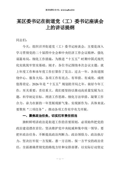 【七哥公文】2026年:某区委书记在街道党(工)委书记座谈会上的讲话提纲+更多免费公文+VX:QiGeGongWen2024