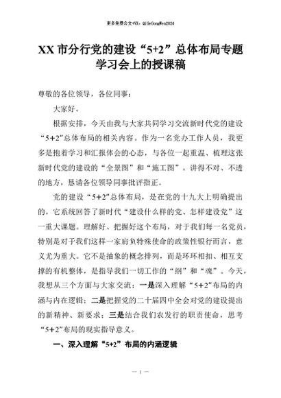 【七哥公文】2026年:XX市分行党的建设“5+2”总体布局专题学习会上的授课稿+更多免费公文+VX:QiGeGongWen2024