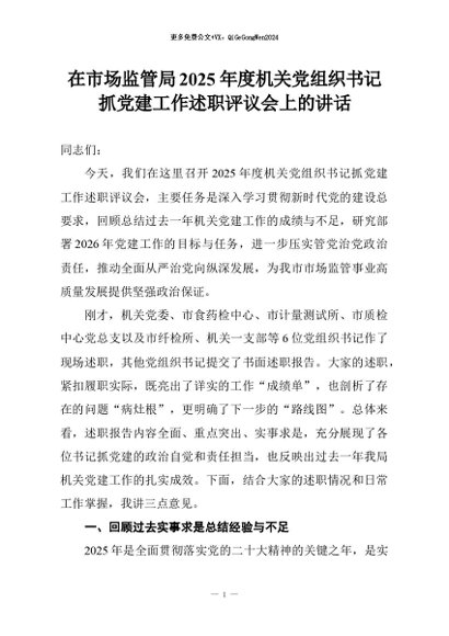 【七哥公文】2026年:在市场监管局2025年度机关党组织书记抓党建工作述职评议会上的讲话+更多免费公文+VX:QiGeGongWen2024