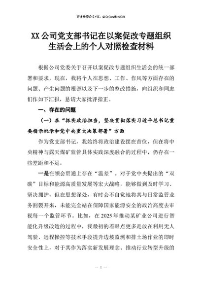 【七哥公文】2026年:XX公司党支部书记在以案促改专题组织生活会上的个人对照检查材料+更多免费公文+VX:QiGeGongWen2024