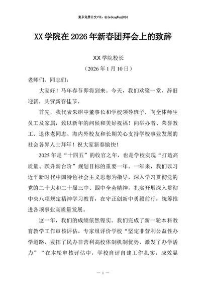 【七哥公文】2026年:XX学院在2026年新春团拜会上的致辞+更多免费公文+VX:QiGeGongWen2024