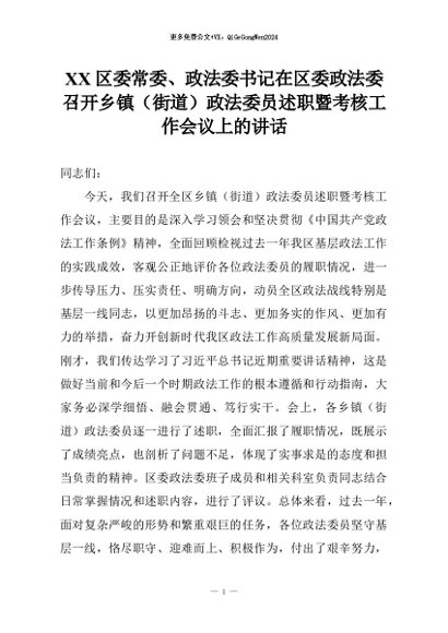 【七哥公文】2026年:XX区委常委、政法委书记在区委政法委召开乡镇(街道)政法委员述职暨考核工作会议上的讲话+更多免费公文+VX:QiGeGongWen2024
