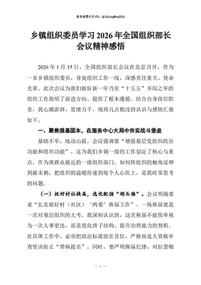 【七哥公文】2026年:乡镇组织委员学习2026年全国组织部长会议精神感悟+更多免费公文+VX:QiGeGongWen2024