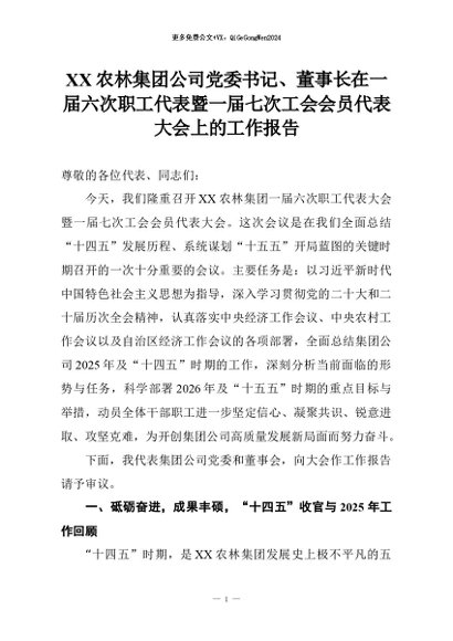 【七哥公文】2026年:XX农林集团公司党委书记、董事长在一届六次职工代表暨一届七次工会会员代表大会上的工作报告+更多免费公文+VX:QiGeGongWen2024