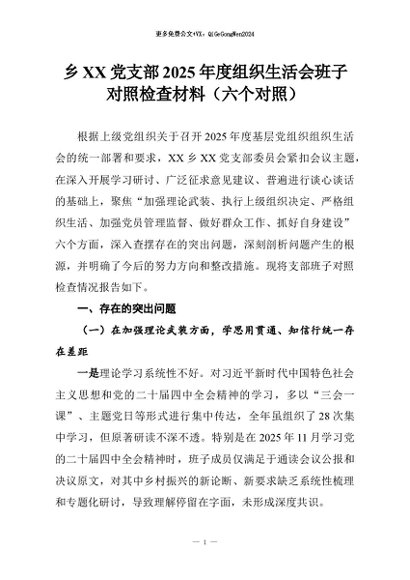 【七哥公文】2026年:乡XX党支部2025年度组织生活会班子对照检查材料(六个对照)+更多免费公文+VX:QiGeGongWen2024