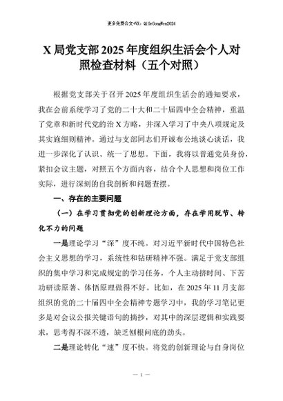 【七哥公文】2026年:X局党支部2025年度组织生活会个人对照检查材料(五个对照)+更多免费公文+VX:QiGeGongWen2024