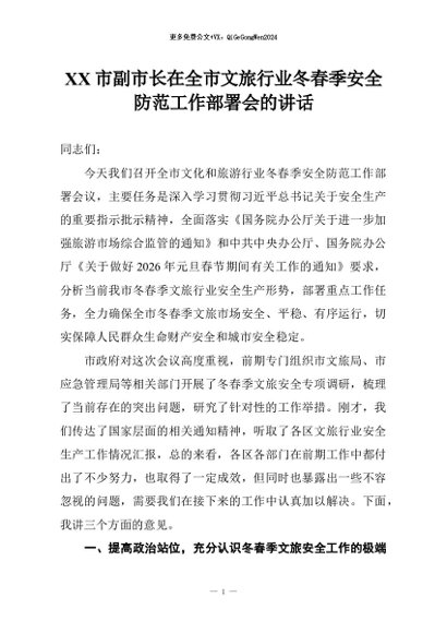 【七哥公文】2026年:XX市副市长在全市文旅行业冬春季安全防范工作部署会的讲话+更多免费公文+VX:QiGeGongWen2024