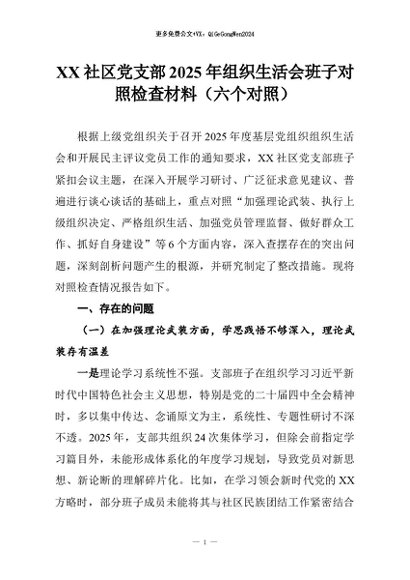 【七哥公文】2026年:XX社区党支部2025年组织生活会班子对照检查材料(六个对照)+更多免费公文+VX:QiGeGongWen2024