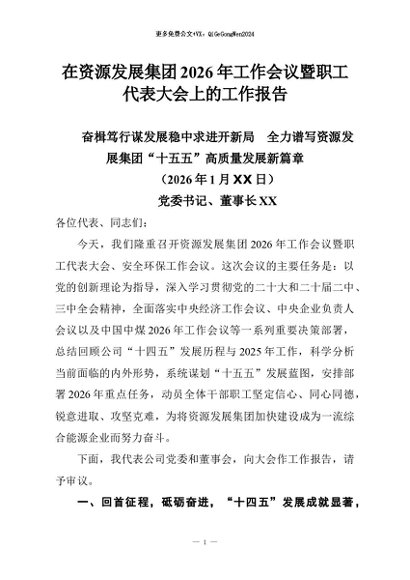 【七哥公文】2026年:在资源发展集团2026年工作会议暨职工代表大会上的工作报告+更多免费公文+VX:QiGeGongWen2024