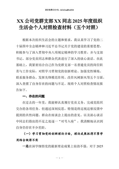 【七哥公文】2026年:XX公司党群支部XX同志2025年度组织生活会个人对照检查材料(五个对照)+更多免费公文+VX:QiGeGongWen2024