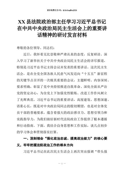 【七哥公文】2026年:XX县法院政治部主任学习习近平总书记在中共中央政治局民主生活会上的重要讲话精神的研讨发言材料+更多免费公文+VX:QiGeGongWen2024