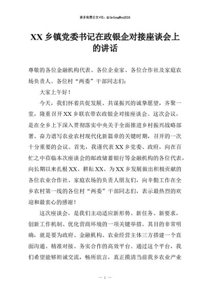 【七哥公文】2026年:XX乡镇党委书记在政银企对接座谈会上的讲话+更多免费公文+VX:QiGeGongWen2024