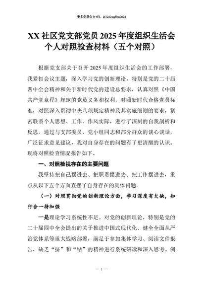 【七哥公文】2026年:XX社区党支部党员2025年度组织生活会个人对照检查材料(五个对照)+更多免费公文+VX:QiGeGongWen2024