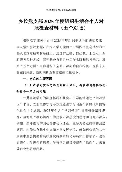 【七哥公文】2026年:乡长党支部2025年度组织生活会个人对照检查材料(五个对照)+更多免费公文+VX:QiGeGongWen2024