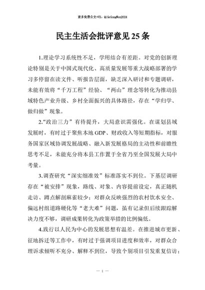 【七哥公文】2026年:民主生活会批评意见25条+更多免费公文+VX:QiGeGongWen2024