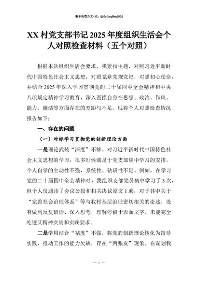【七哥公文】2026年:XX村党支部书记2025年度组织生活会个人对照检查材料(五个对照)+更多免费公文+VX:QiGeGongWen2024