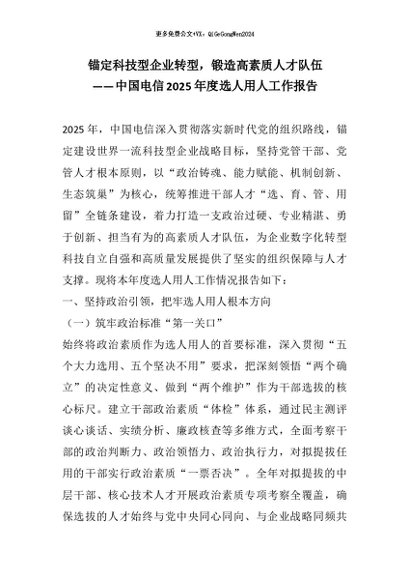 【七哥公文】2026年:锚定科技型企业转型,锻造高素质人才队伍——中国电信2025年度选人用人工作报告+更多免费公文+VX:QiGeGongWen2024