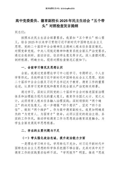 【七哥公文】2026年:高中党委委员、德育副校长2025年民主生活会“五个带头”对照检查发言提纲+更多免费公文+VX:QiGeGongWen2024