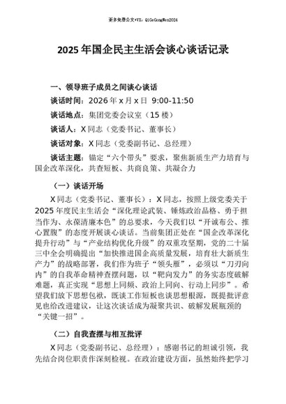【七哥公文】2026年:2025年国企民主生活会谈心谈话记录+更多免费公文+VX:QiGeGongWen2024