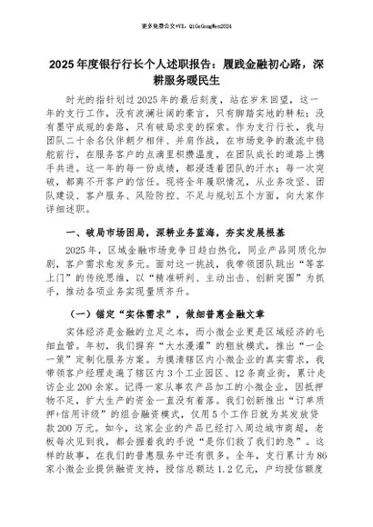 【七哥公文】2026年:2025年度银行行长个人述职报告:履践金融初心路,深耕服务暖民生+更多免费公文+VX:QiGeGongWen2024