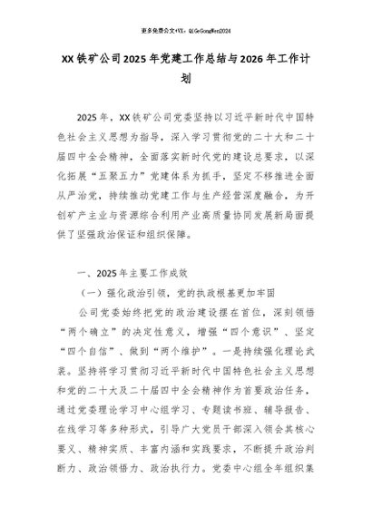 【七哥公文】2026年:XX铁矿公司2025年党建工作总结与2026年工作计划_副本+更多免费公文+VX:QiGeGongWen2024