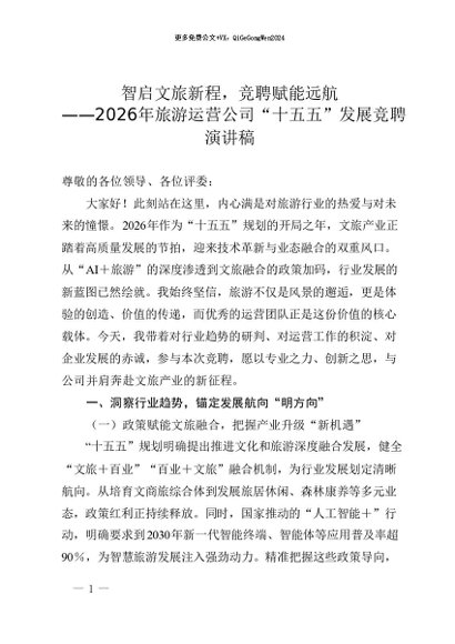 【七哥公文】2026年:2026年旅游运营公司“十五五”发展竞聘演讲稿:智启文旅新程,竞聘赋能远航+更多免费公文+VX:QiGeGongWen2024