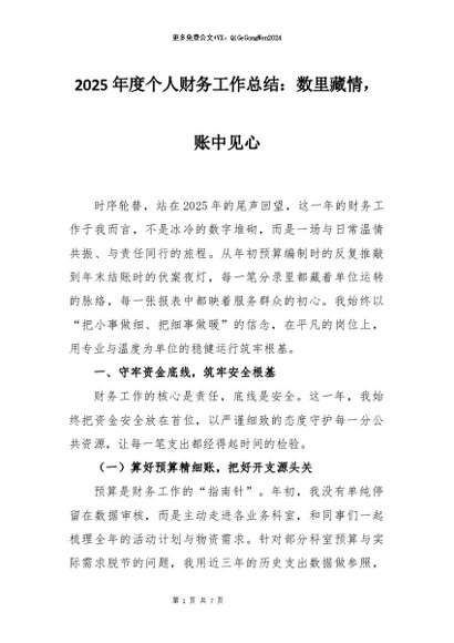 【七哥公文】2026年:2025年度个人财务工作总结:数里藏情,账中见心+更多免费公文+VX:QiGeGongWen2024