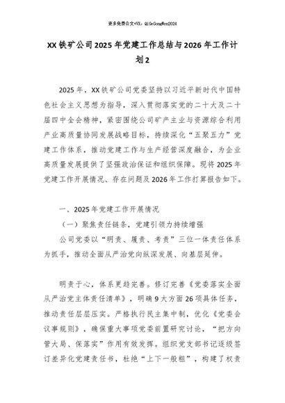 【七哥公文】2026年:XX铁矿公司2025年党建工作总结与2026年工作计划2_副本+更多免费公文+VX:QiGeGongWen2024