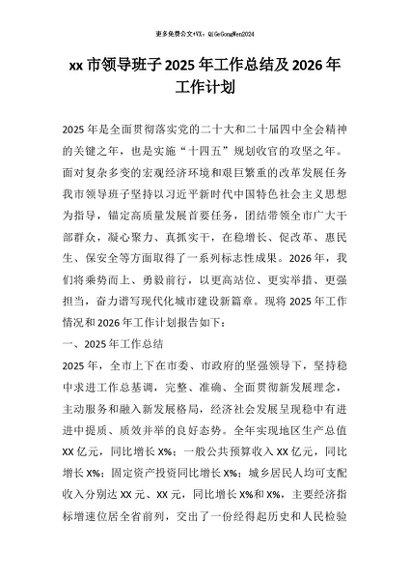 【七哥公文】2026年:xx市领导班子2025年工作总结及2026年工作计划+更多免费公文+VX:QiGeGongWen2024