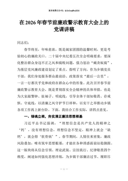 / 【七哥公文】2026年:在2026年春节前廉政警示教育大会上的党课讲稿+更多免费公文+VX:QiGeGongWen2024