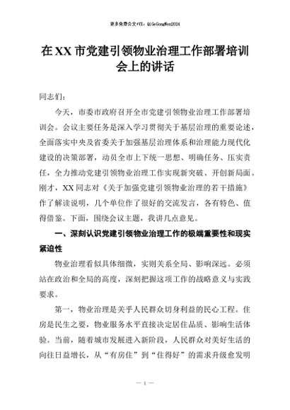 【七哥公文】2026年:在XX市党建引领物业治理工作部署培训会上的讲话+更多免费公文+VX:QiGeGongWen2024