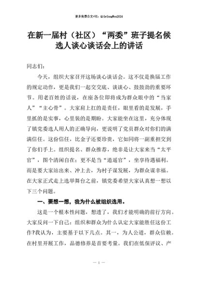 【七哥公文】2026年:在新一届村(社区)“两委”班子提名候选人谈心谈话会上的讲话+更多免费公文+VX:QiGeGongWen2024